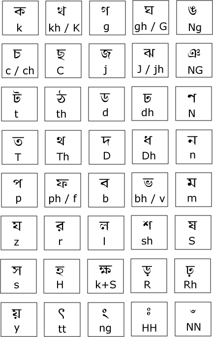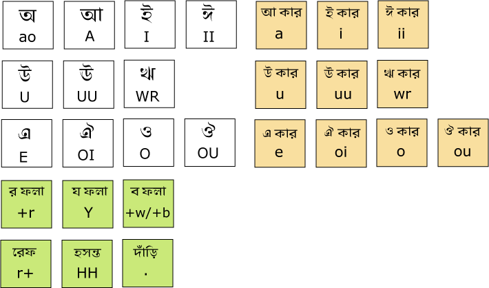 How to write Bangla phonetically?Take a look below at the character map. It shows you the key map to every character. You just press them and you will see bangla as output. As this is phonetic, You have to write kars after the character. Here are some examples: |